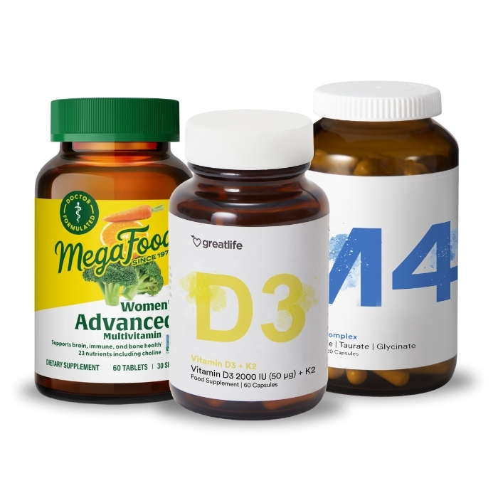 Baspaket Kvinna är ett paket för kvinnor under 55 år. Det innehåller en riktigt bra whole food multivitaminmineral speciellt framtagen för kvinnor, D-vitamin och magnesium.