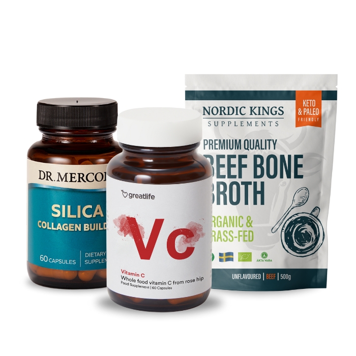 Tre superprodukter för optimal bildning av friskt kollagen i ett paket. Ekologisk Benbuljong Premium innehåller 84 % kollagen. Dr. Mercolas Silica Collagen Builder – Kisel Kollagen är av den bästa produkterna som finns för att bygga friskt kollagen. C-vitamin av whole food-kvalitet som bidrar till kollagenbildning.